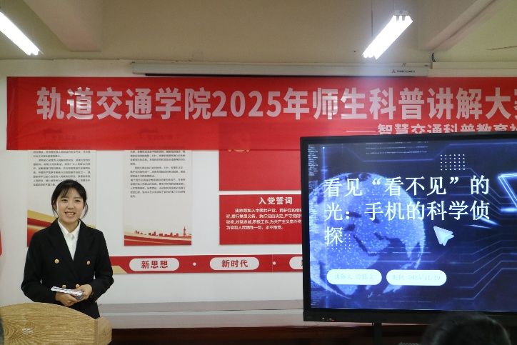 为深入贯彻党的二十大精神,全面落实科教融汇战略部署,着力培育创新文化、提升青年学生科学素养,11月19日,轨道交通学院在第一实训楼D512会议室顺利举办2025 年科普讲解大赛。本次活动由学院智慧交通科普社团精心策划主办,吸引了来自不同专业、不同年级的19名科普爱好者同台竞技,学院党总支副书记蒋晶晶、科研技术处副处长欧彦江及专业教师周艳艳受邀担任评委,学生胡巍全程主持赛事。