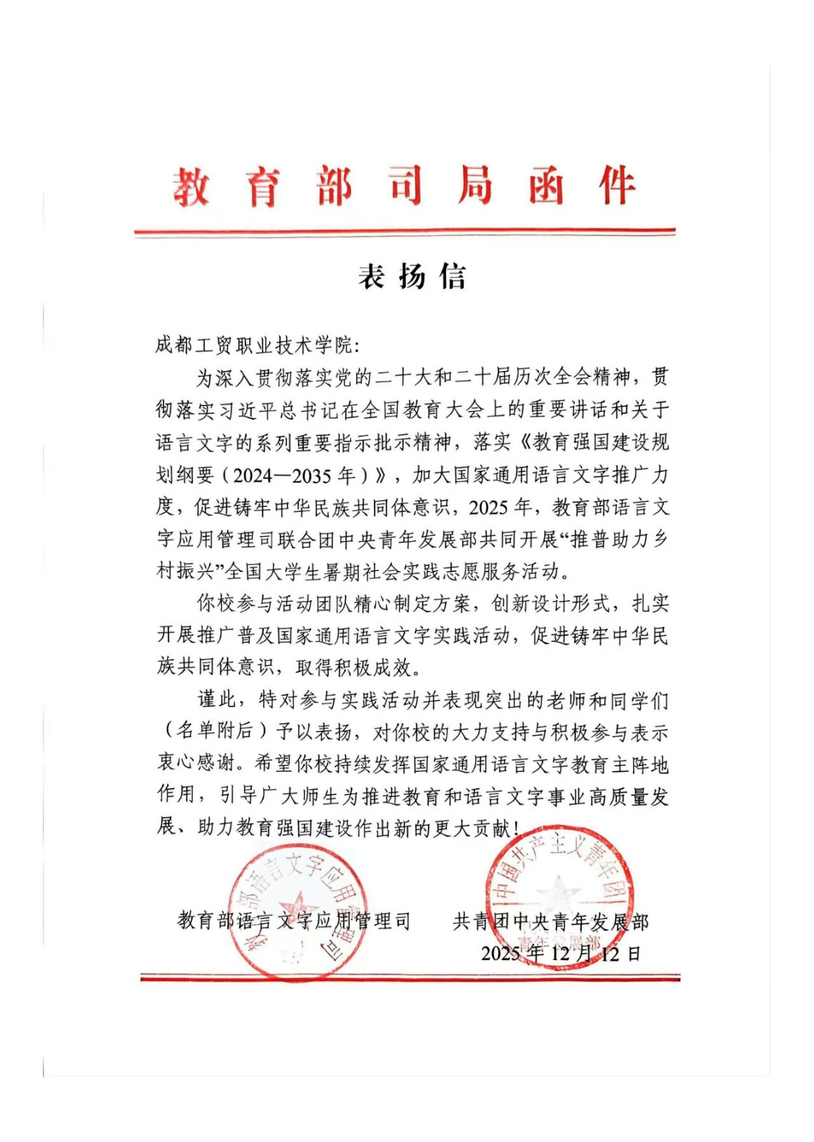 教育部语言文字应用管理司、共青团中央青年发展部作为主办方联合通报表扬。表扬信中对学院团队的实践成果给予了高度肯定,特别赞扬了师生们“以语言为桥、甘于奉献的责任担当” ,认为活动生动彰显了学校 “实践育人、服务社会” 的扎实成效。这份荣誉不仅是对团队辛勤付出的国家级认可,更是对我校持续深化社会实践、积极融入国家战略的鼓舞。