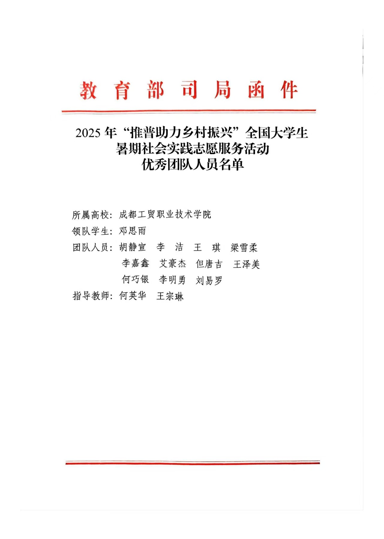 近日,2025年“推普助力乡村振兴”全国大学生暑期社会实践志愿服务活动评选结果正式公布。我院申报的 “索玛花开推普路,彝乡童声话振兴”社会实践志愿服务团,凭借其系统、扎实且富有创新的工作成效,从全国2000支团队中脱颖而出,荣获“优秀团队”称号。
