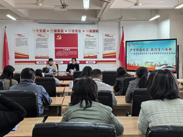 为深入贯彻落实习近平总书记关于教育的重要论述,全面落实为党育人、为国育才初心使命,进一步严明教师职业行为规范,强化师德师风底线意识与红线思维,2026年3月11日下午,轨道交通学院在一实训楼D512会议室组织全体教职工开展了以“严守师德规范 践行育人使命”为主题的2026年第一季度师德师风专题学习活动。
