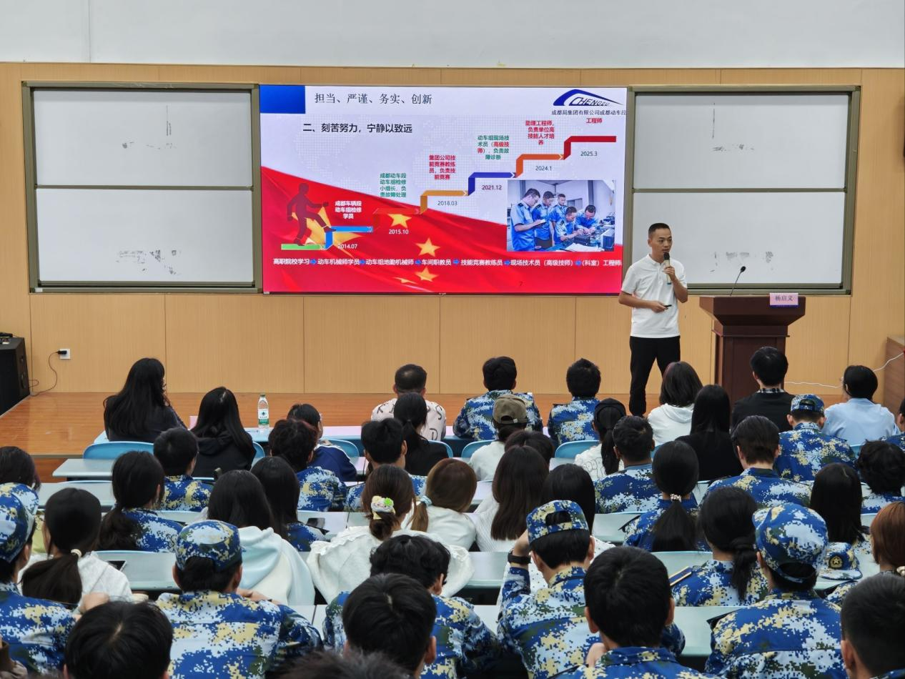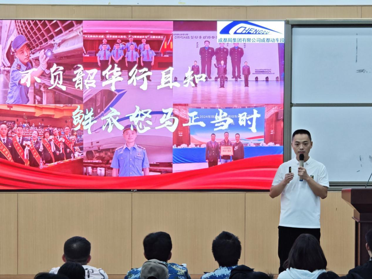 讲座中,杨启义老师以“从一线技工到技能专家”的成长经历为主线,生动阐释了“脚踏实地”与“精益求精”的深刻内涵。自进入成都车辆段以来,他从基础检修岗位起步,通过在技能竞赛中持续磨砺、不断攻克技术难题,逐步荣获“成都工匠”“全国铁路青年岗位能手”“全国五一劳动奖章”等多项荣誉。他强调:“职业发展没有捷径,工匠精神就是坚持把一件事做到极致。”